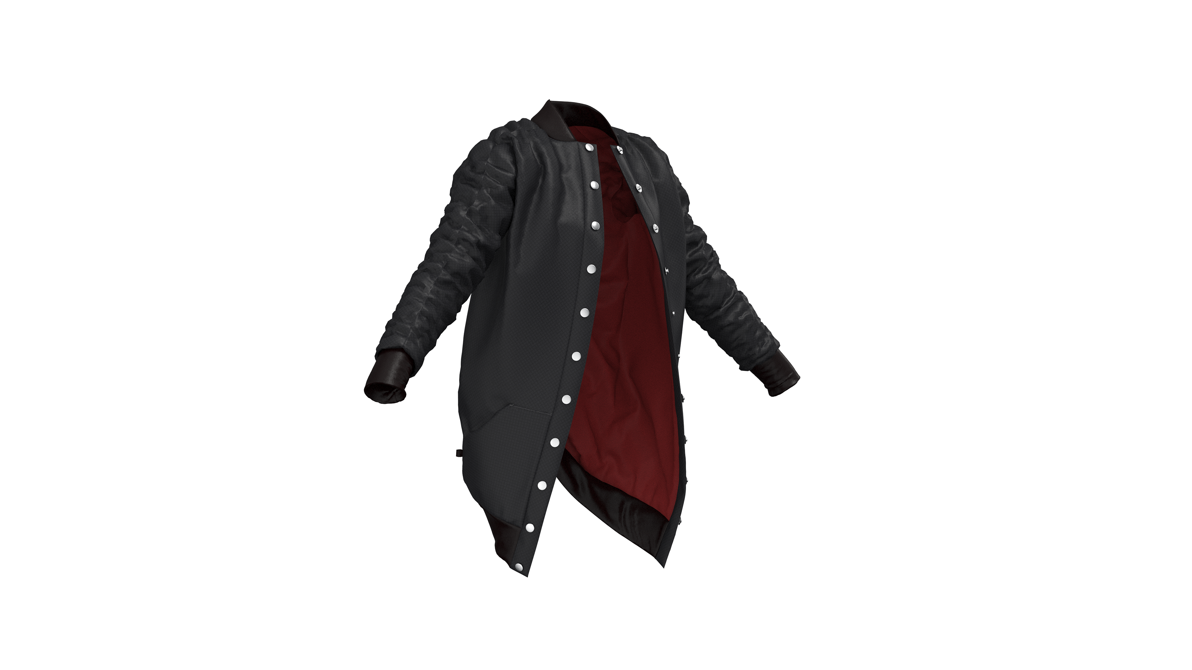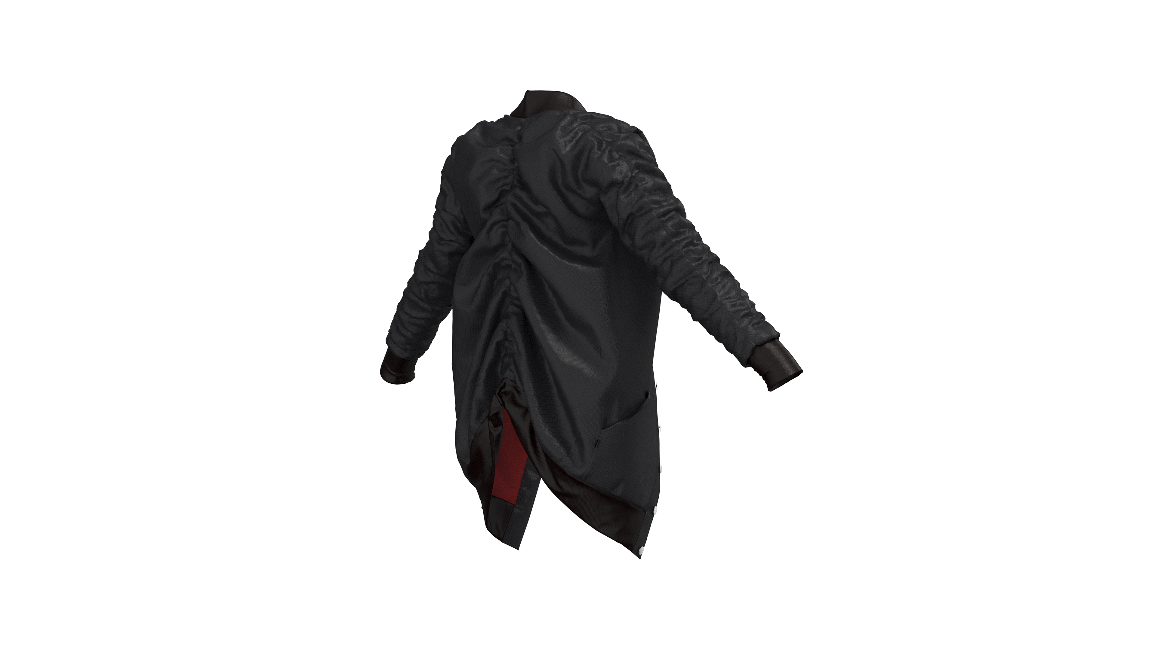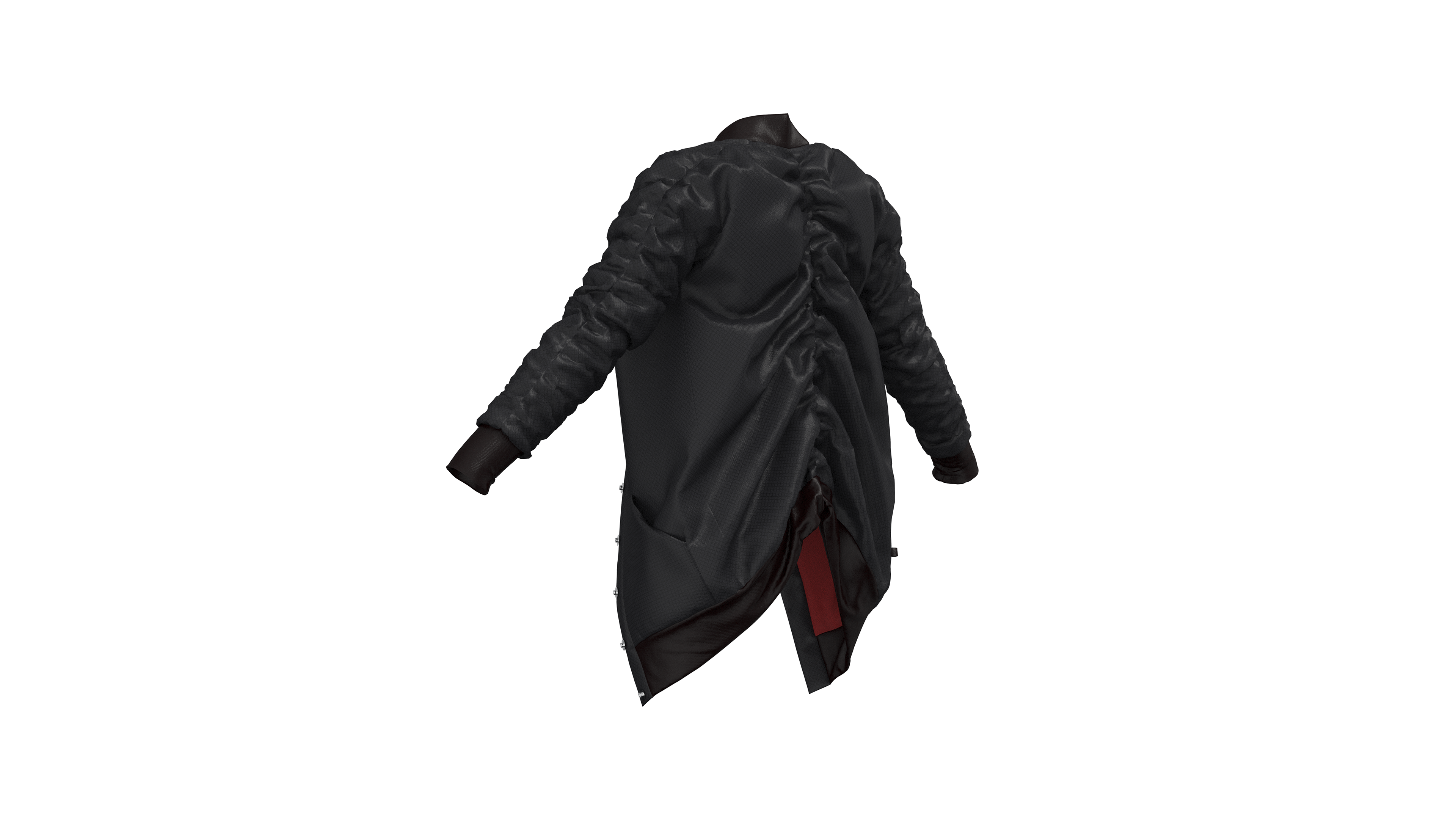 This jacket is part of a larger collection titled “Armor” which explores the relationship between our bodies and the objects we surround them with, and when this relationship moves from protective to harmful. The jacket was designed, patterned, and sewn as a custom piece. I later recreated the patterns in CLO 3D in order to experiment with rendering a product that uses multiple unique materials and has an interesting texture created by the elastic that runs down the sleeves and back. These renderings were created in CLO 3D using custom textures created in Adobe Photoshop.
