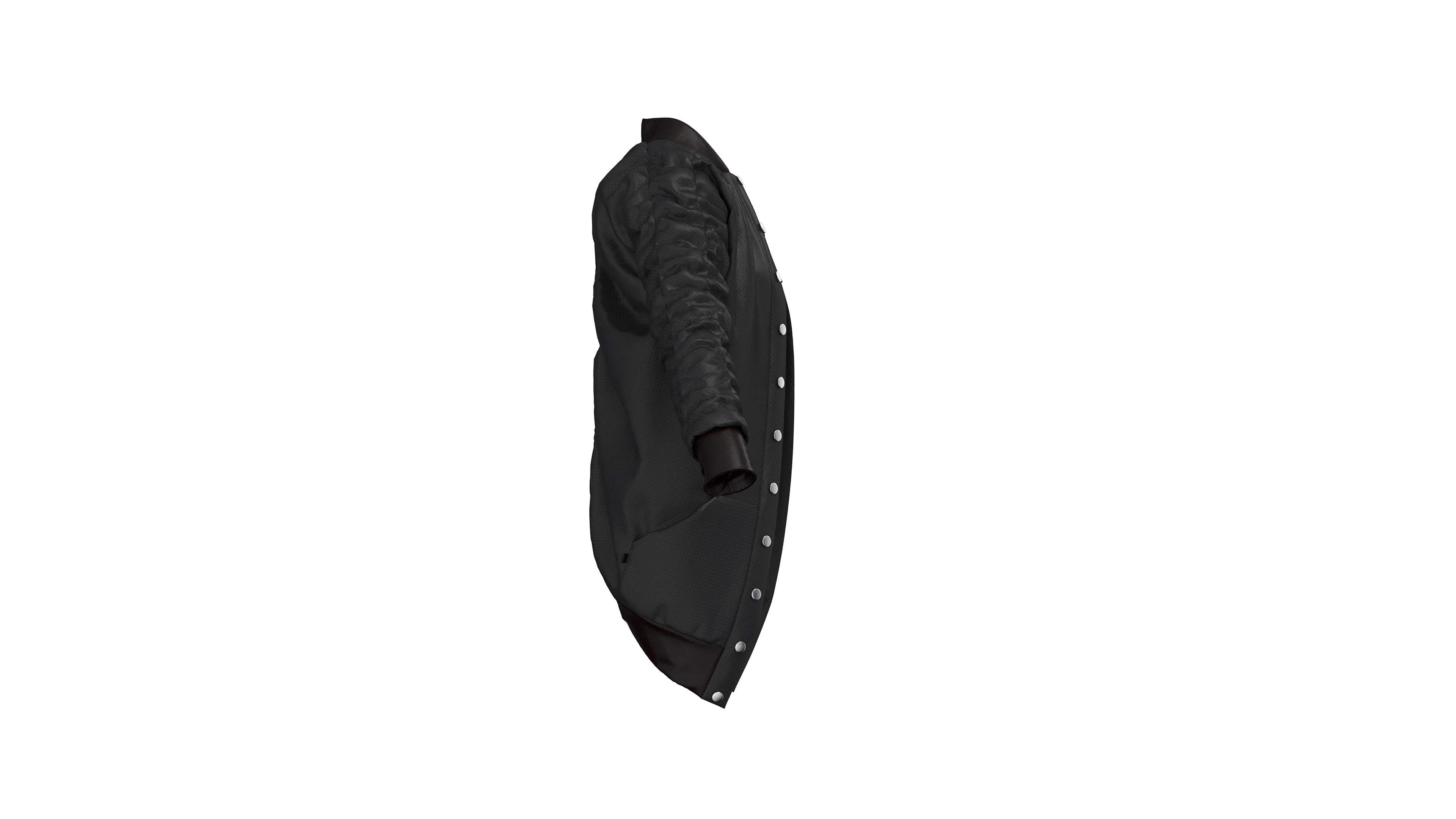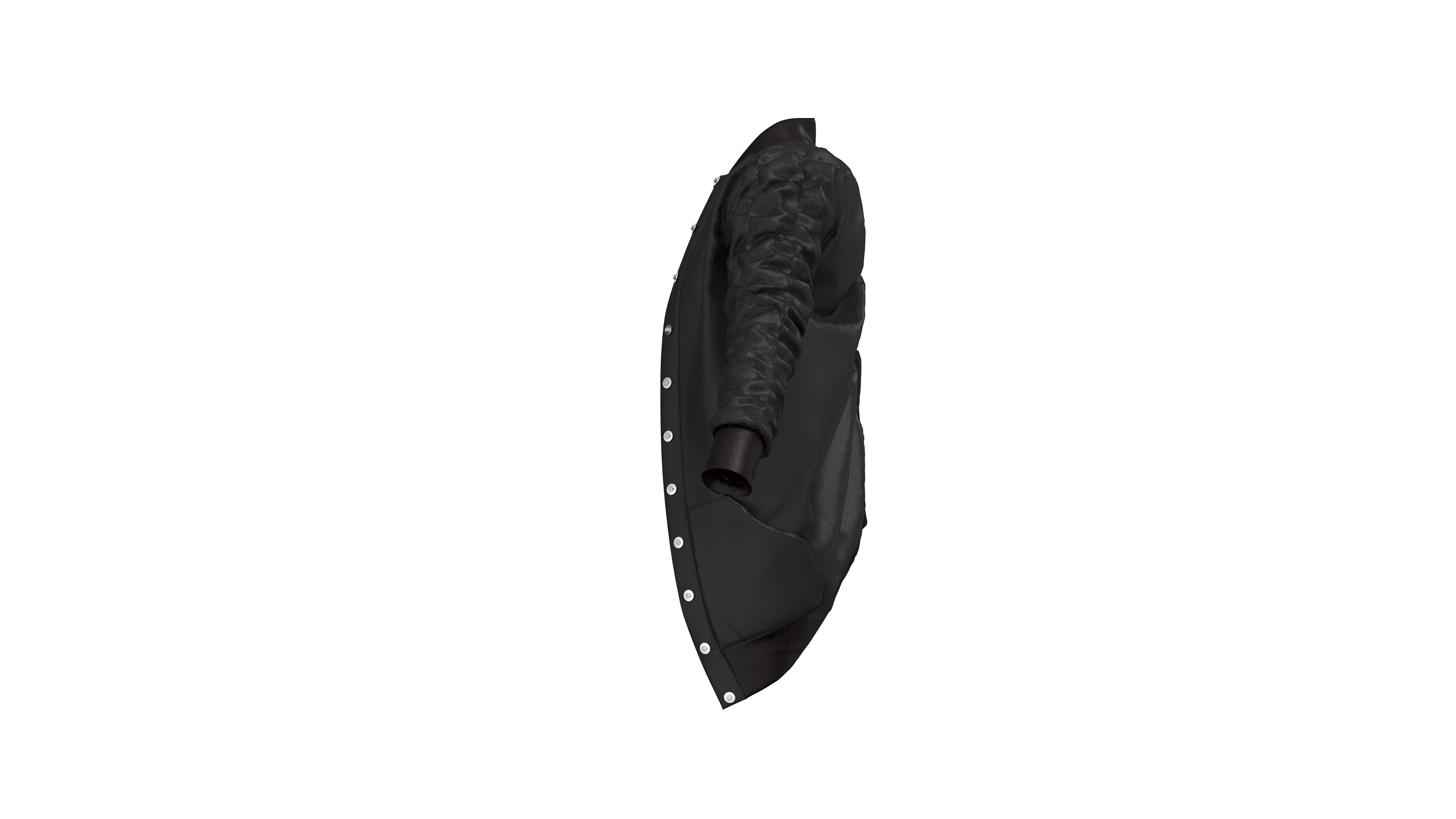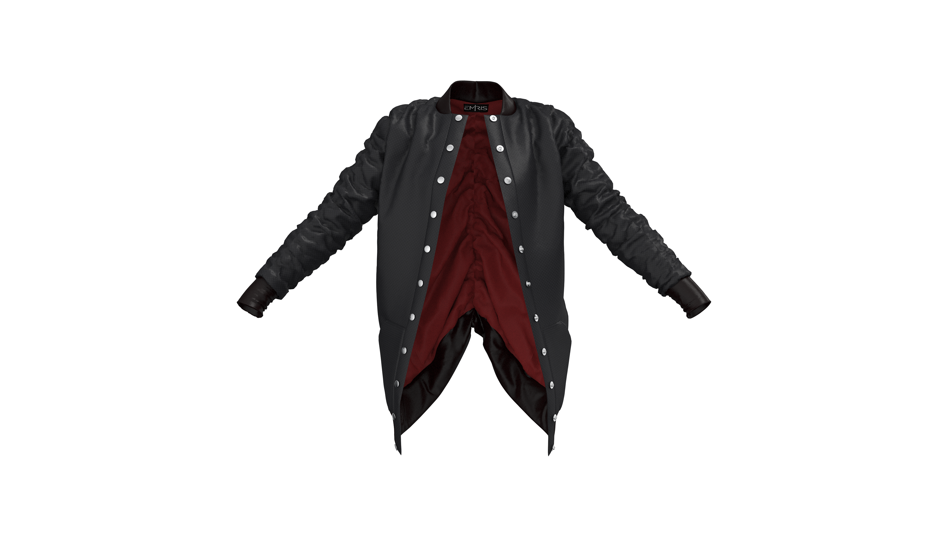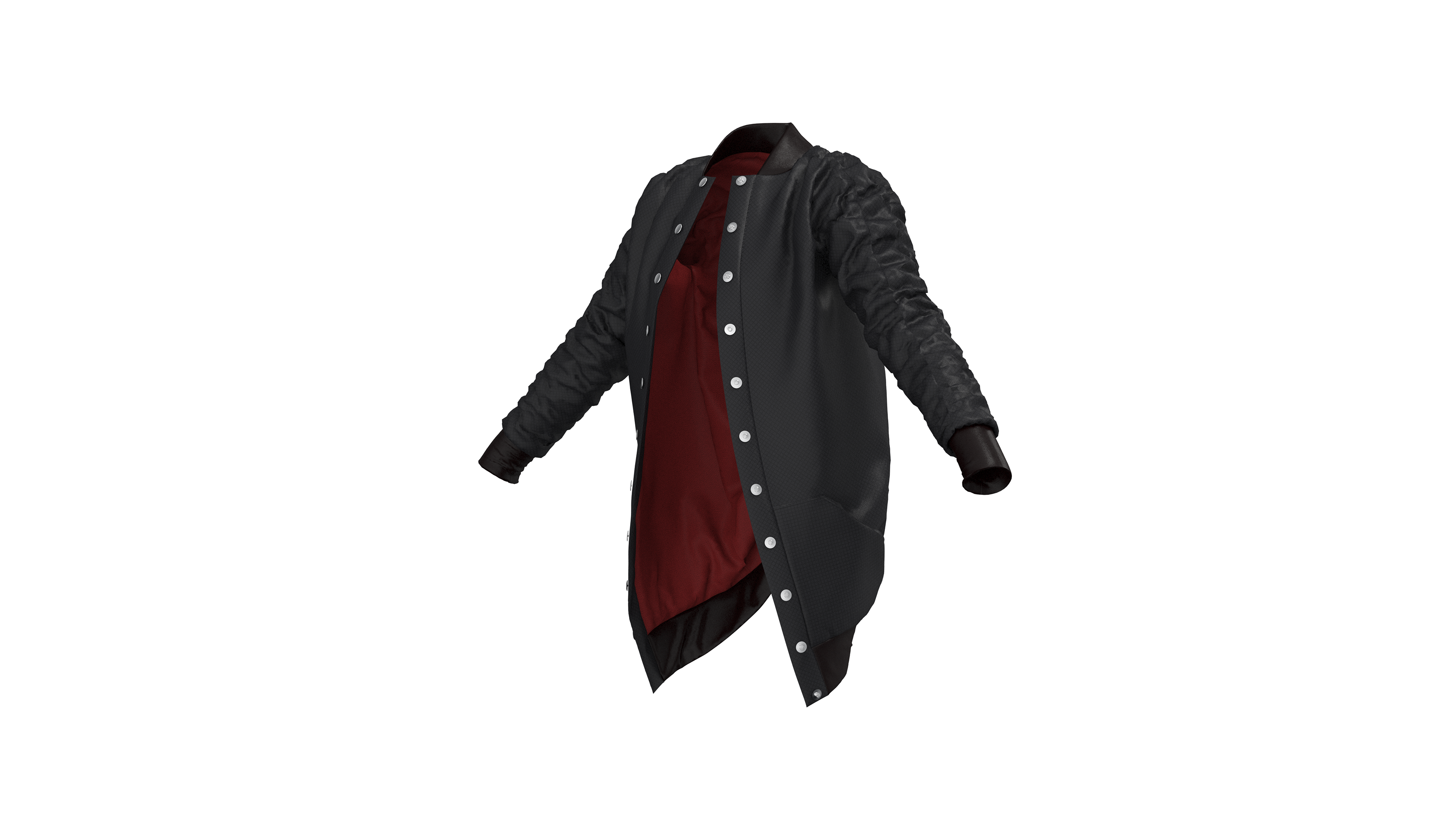 This jacket is part of a larger collection titled “Armor” which explores the relationship between our bodies and the objects we surround them with, and when this relationship moves from protective to harmful. The jacket was designed, patterned, and sewn as a custom piece. I later recreated the patterns in CLO 3D in order to experiment with rendering a product that uses multiple unique materials and has an interesting texture created by the elastic that runs down the sleeves and back. These renderings were created in CLO 3D using custom textures created in Adobe Photoshop.